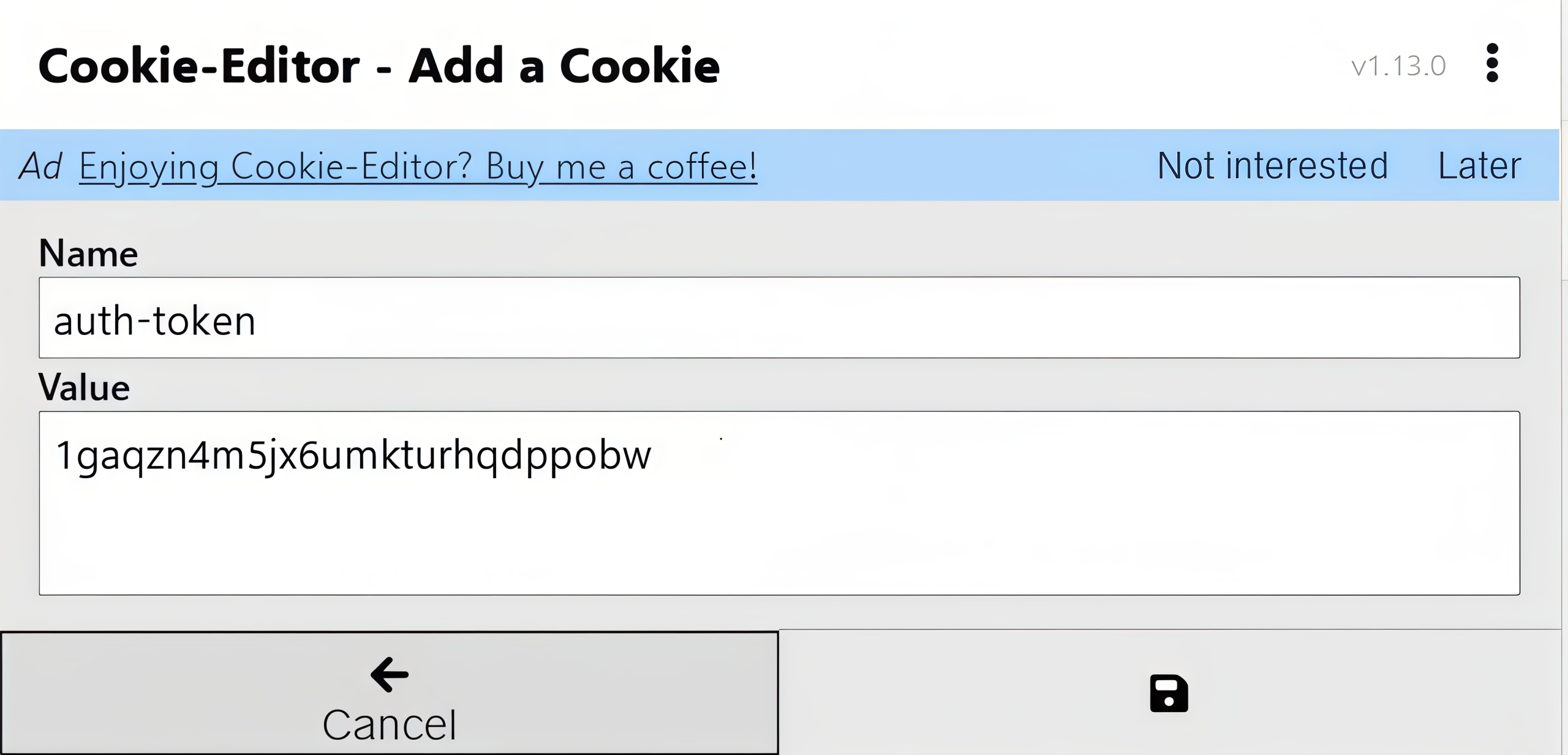 3. Open the cookie management extension, click “Add (+)”, enter “auth-token” in the “Name” field, and in the “Value” field – the token that comes with the account. Save and refresh the page. Done.